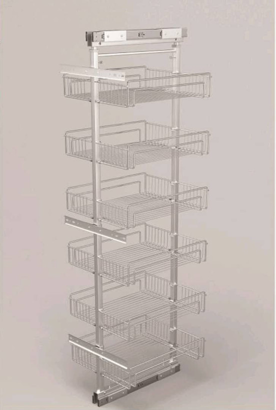 این سوپر مارکت ۶ طبقه برای کابینتهای بلند طراحی شده و با قابلیت تنظیم ارتفاع، برای یونیتهایی با ارتفاع ۲۰۰ تا ۲۲۰ سانتیمتر کاملاً مناسب است. جنس استیل کروم آن ظاهری شیک و مدرن داشته و در برابر رطوبت و زنگزدگی مقاوم است.